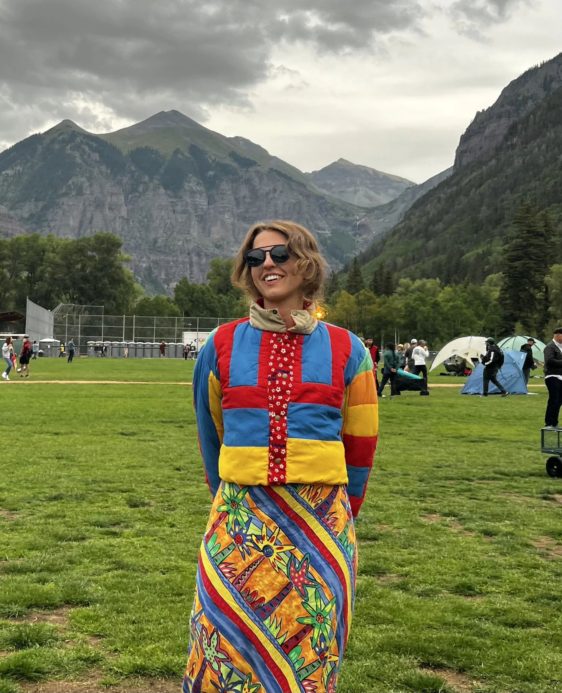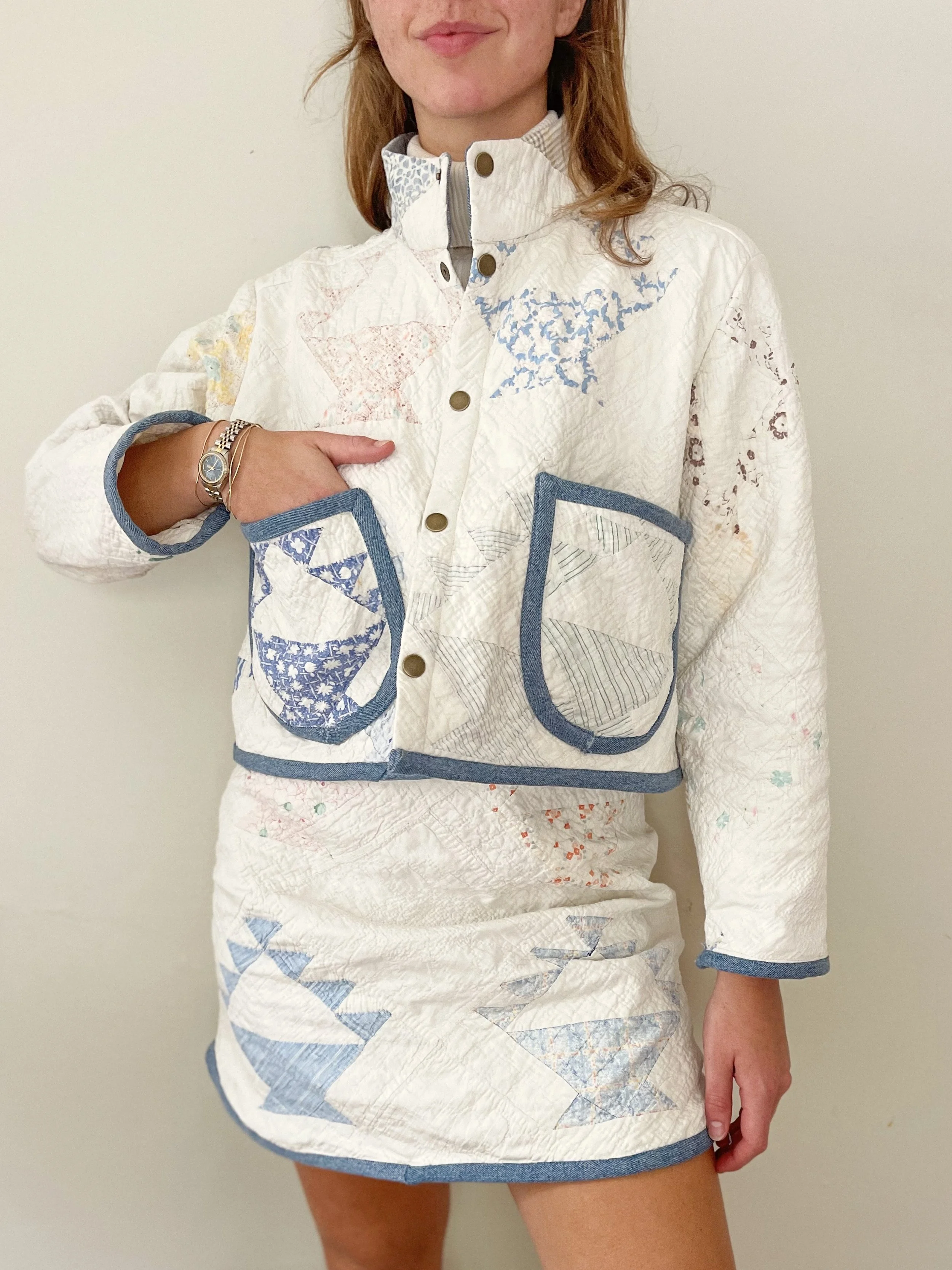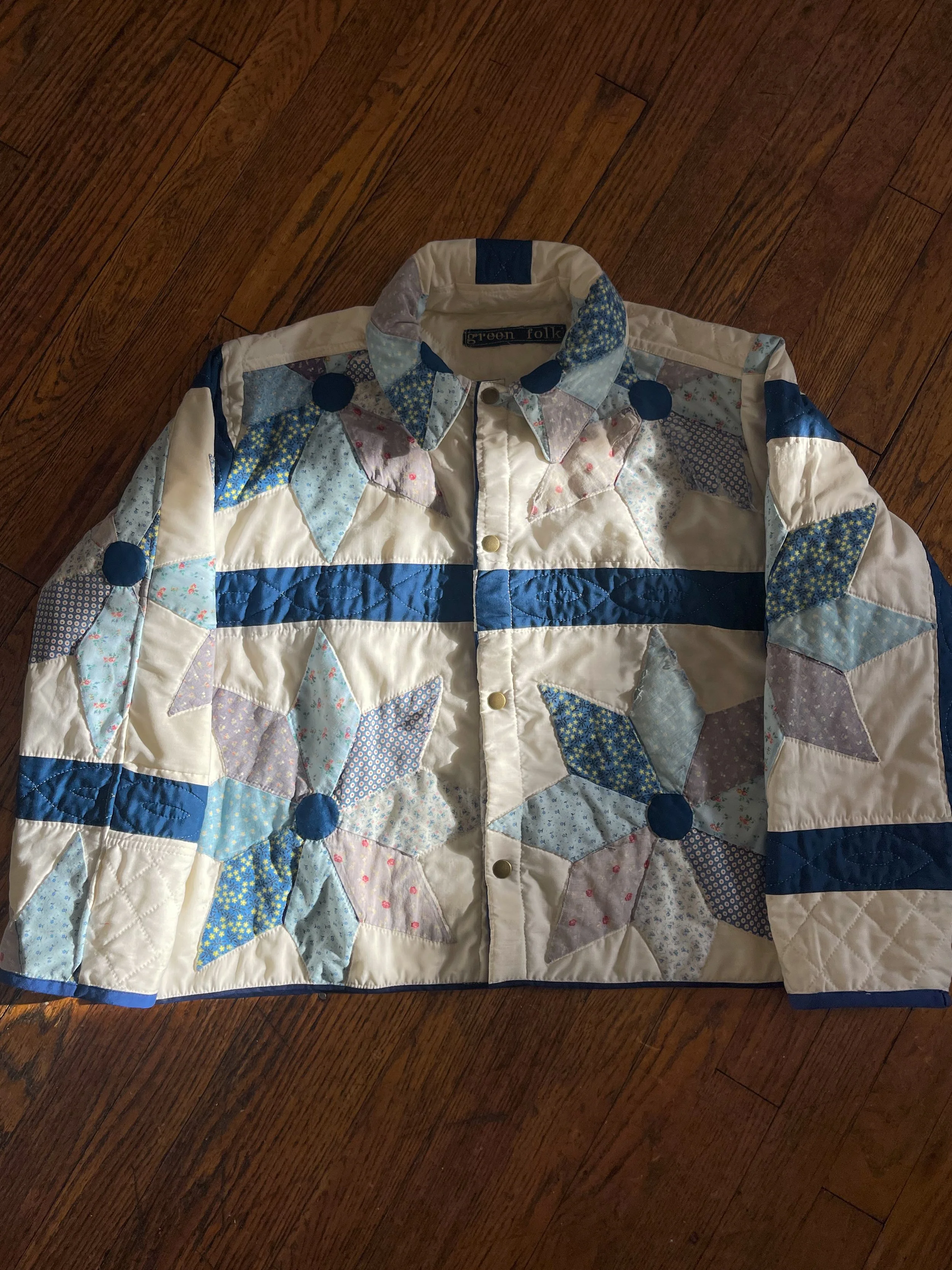 A selection of past quilt coats, thoughtfully crafted from heirloom textiles and personal stories.