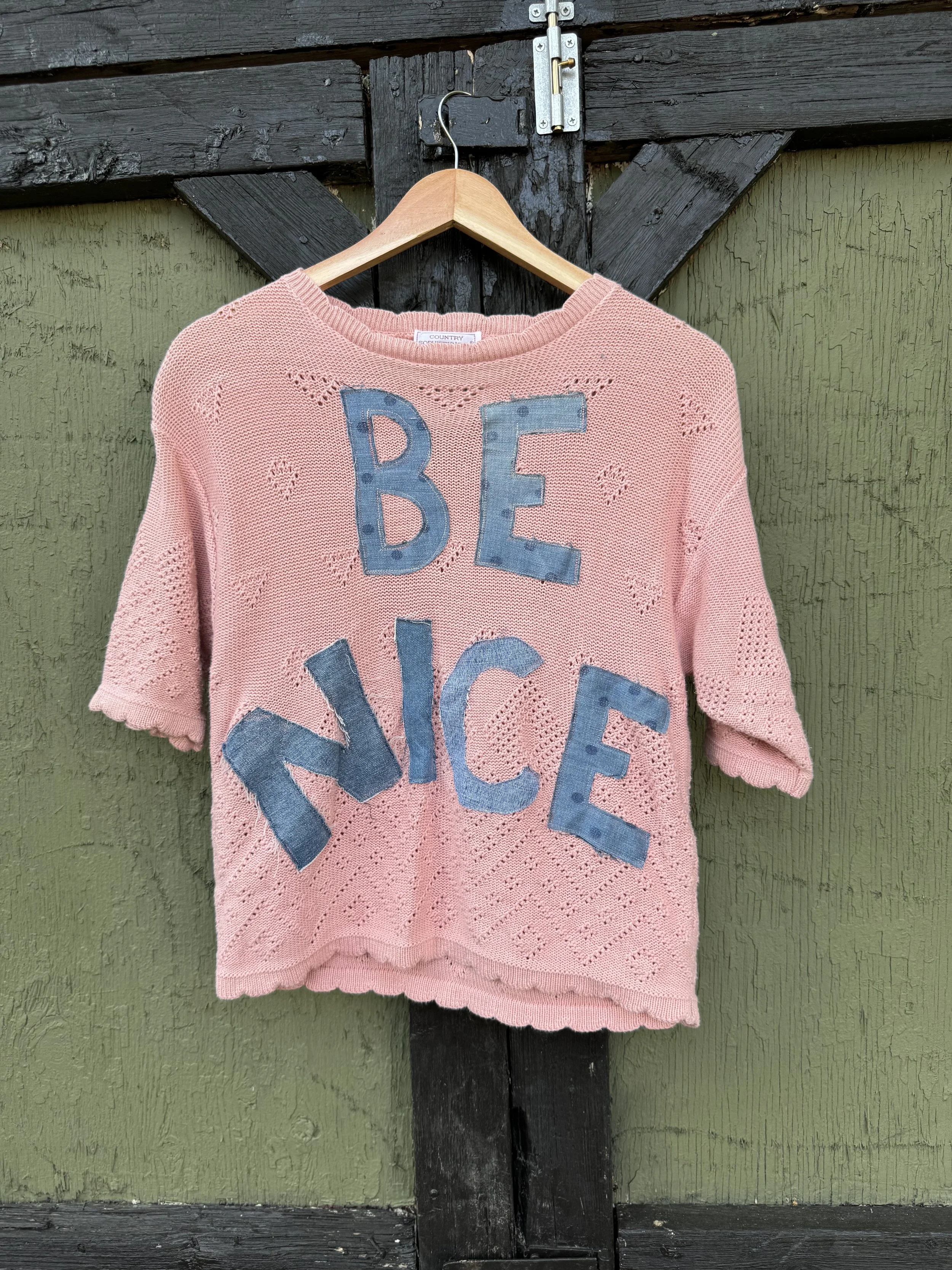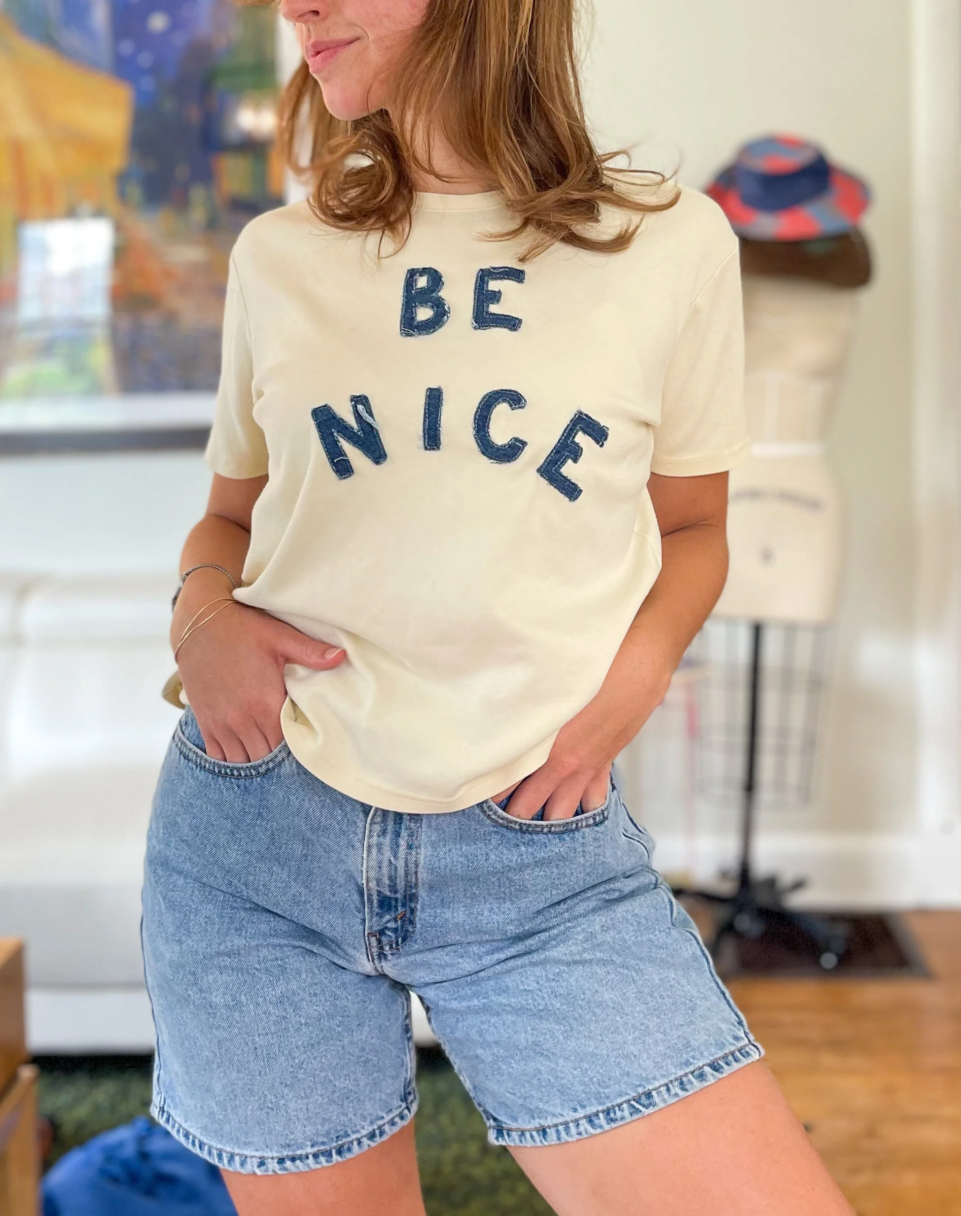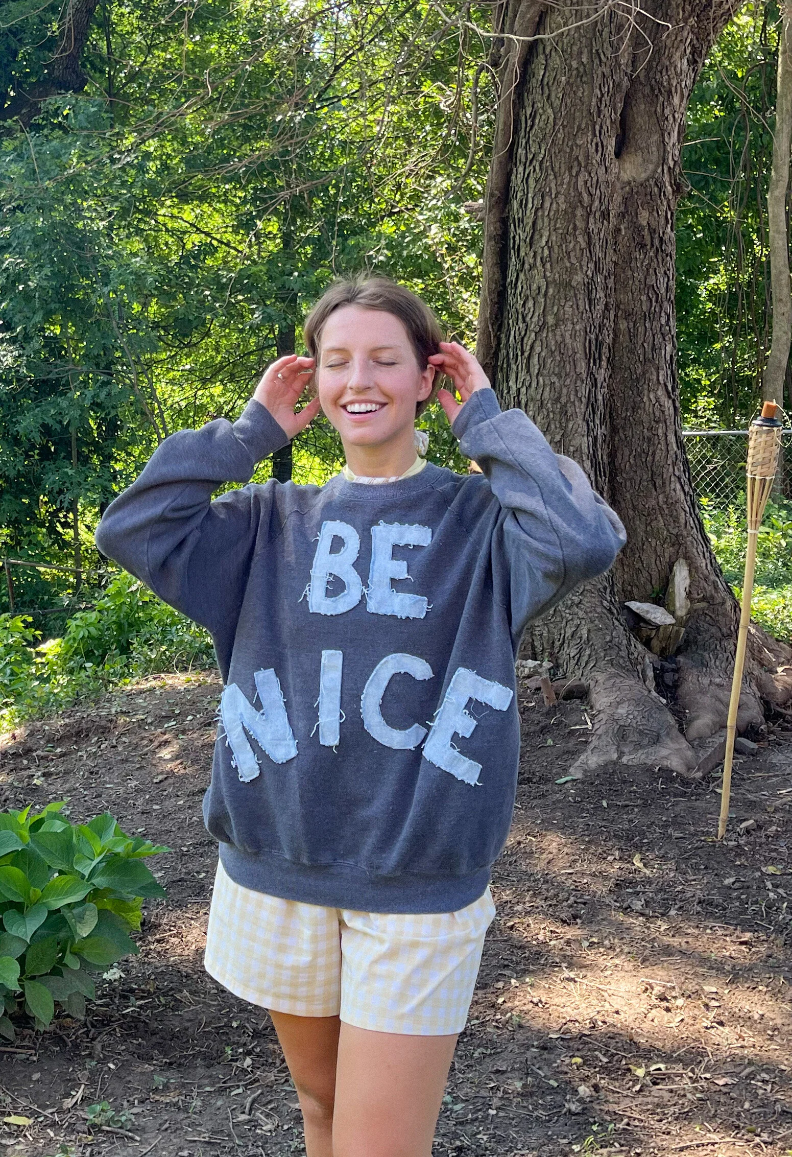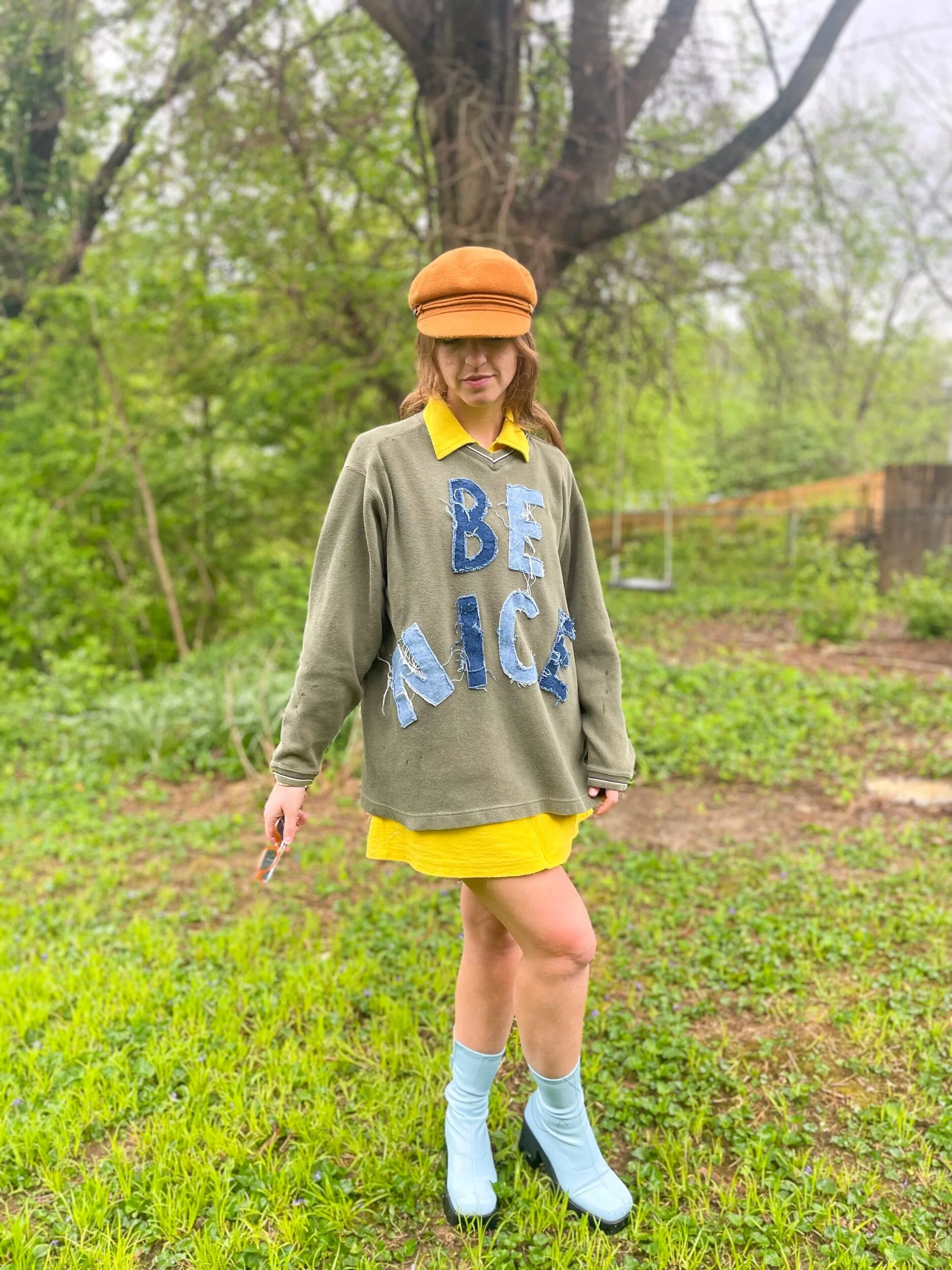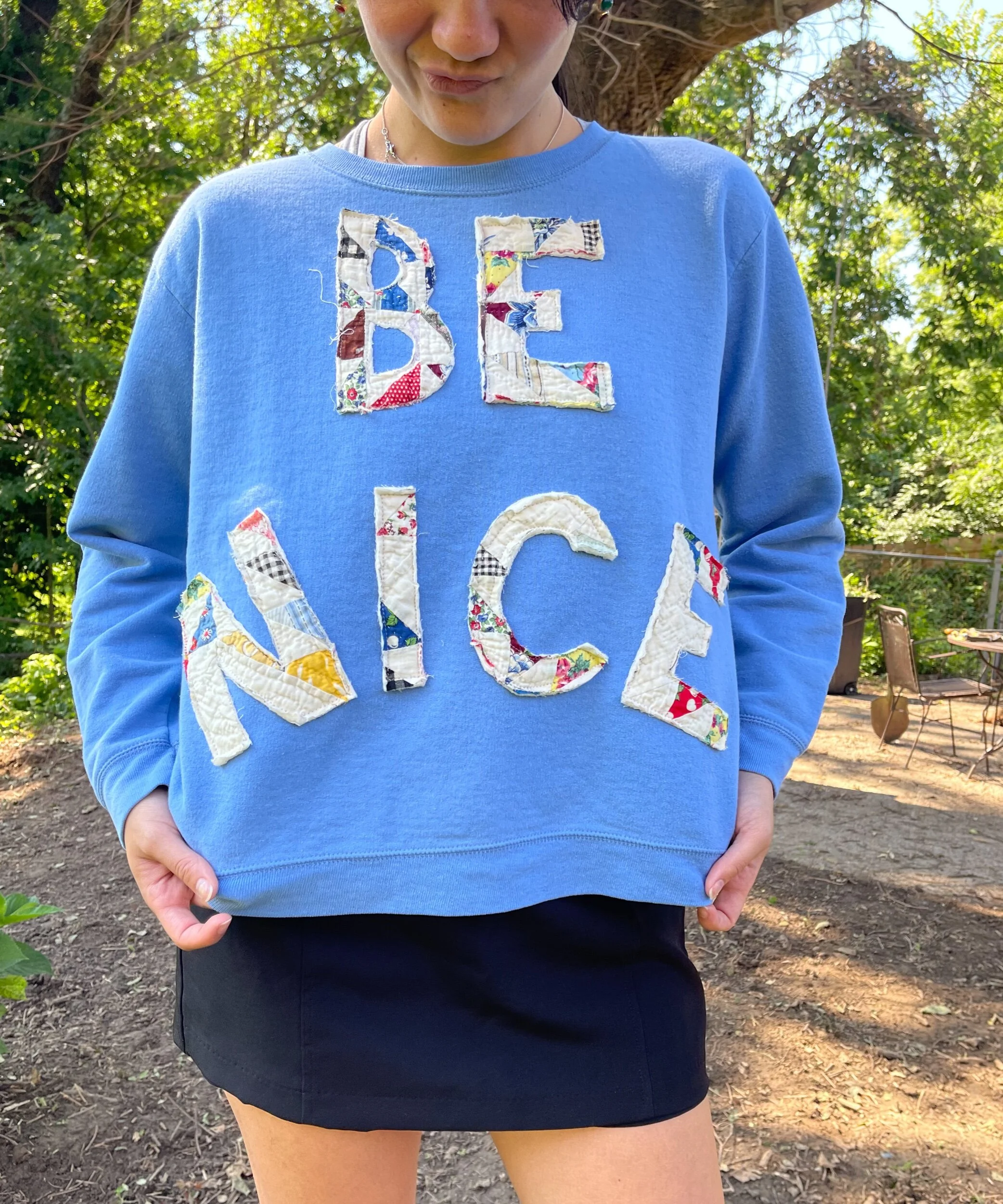 The summer of 2020 I started stitching denim letters onto thrifted crewnecks. My attempt at finding warmth and kindness in the midst of the pandemic. These sweatshirt have taught me so much and have been a big part of my 10,000 hours. Years later these pieces still learning from the ‘Be Nice’ pieces, always serving as a reminder to walk through life with a kind heart no matter what happens. I hope when people see these pieces they stop for a moment and consider how they are showing up for themselves and others. Most of all, I hope you are nice to yourself. Life is hard, and I believe we are all doing the best we can with the tools we have so please choose to be nice. Love you -Mal