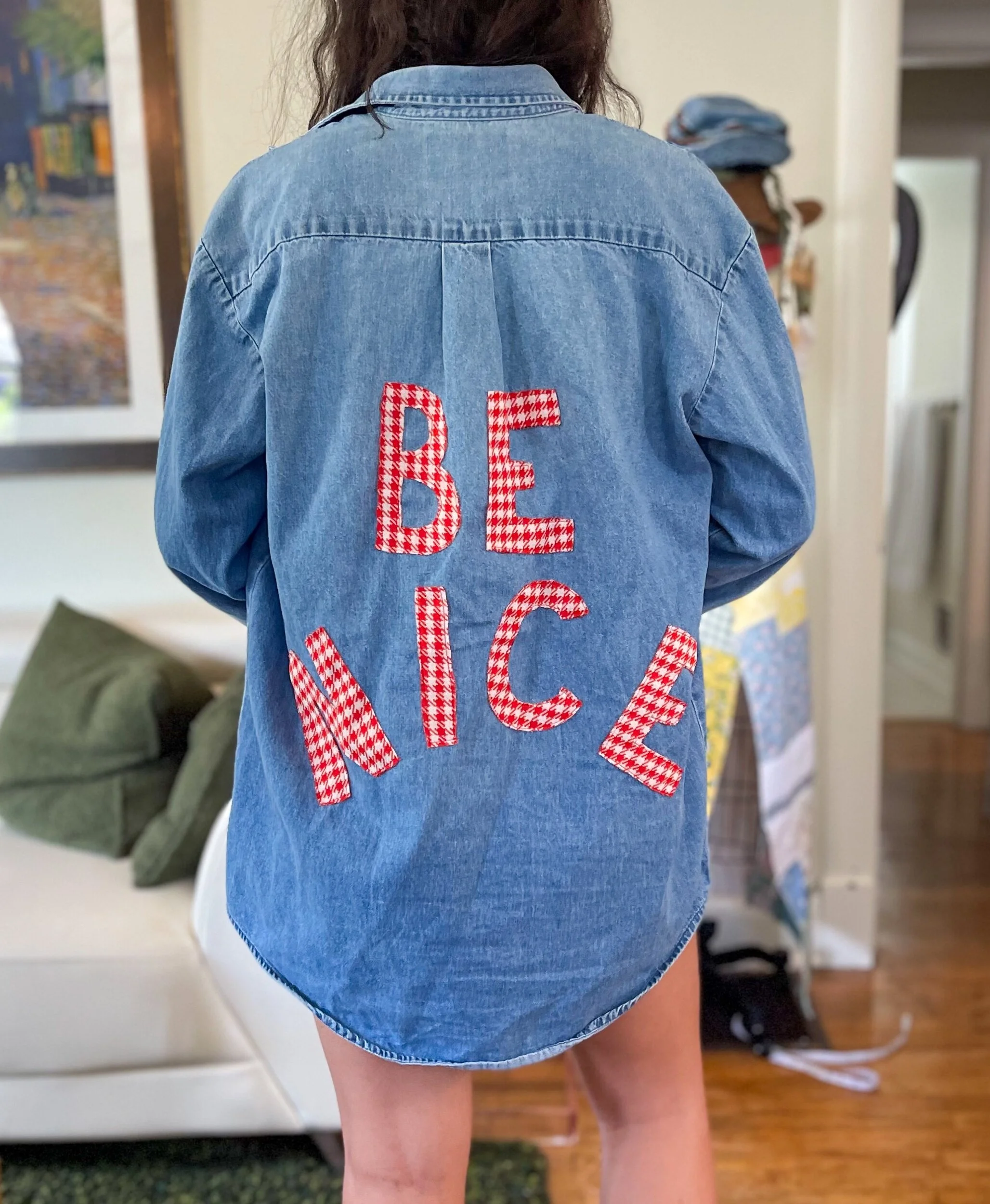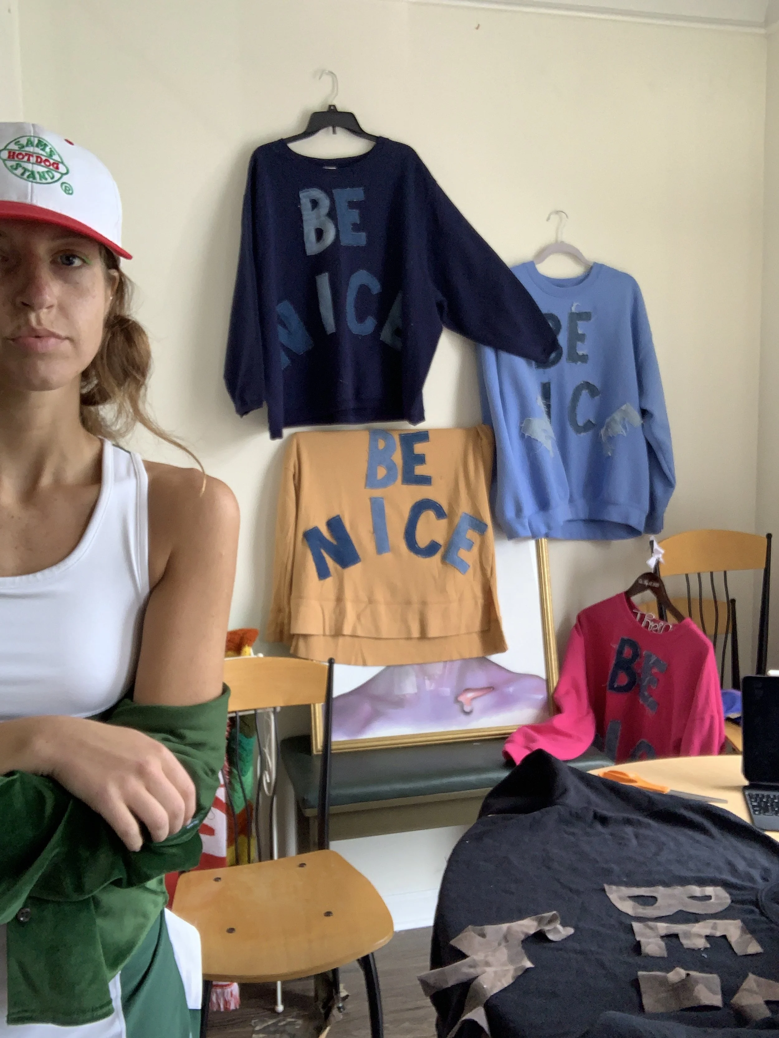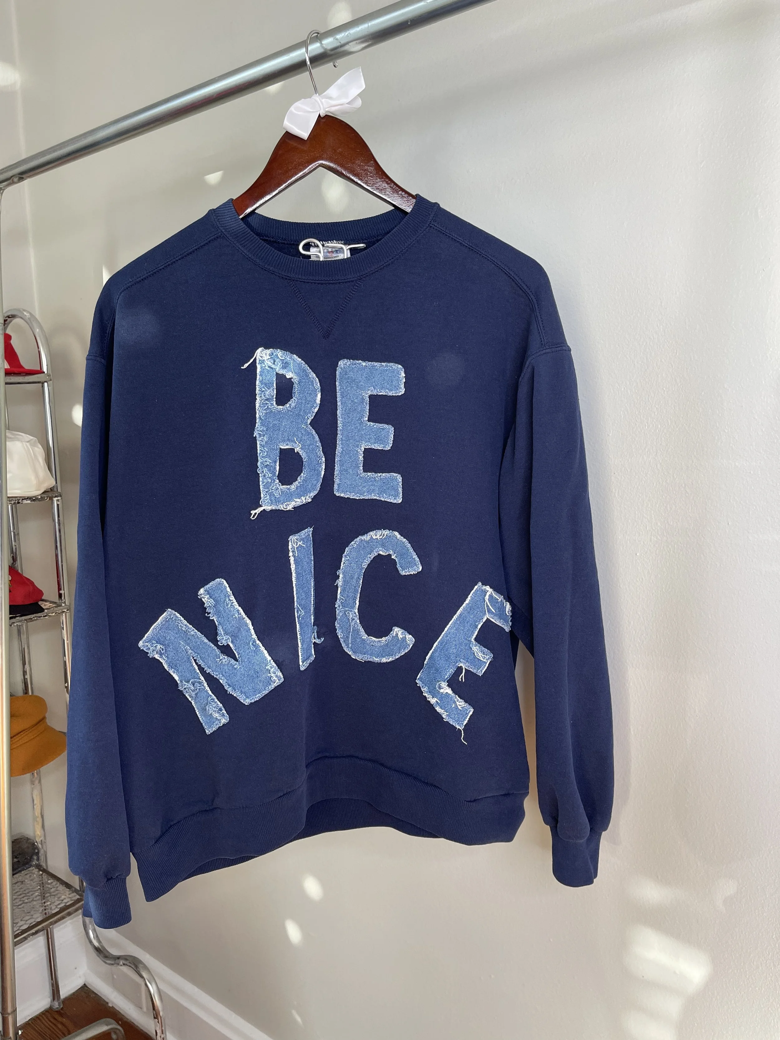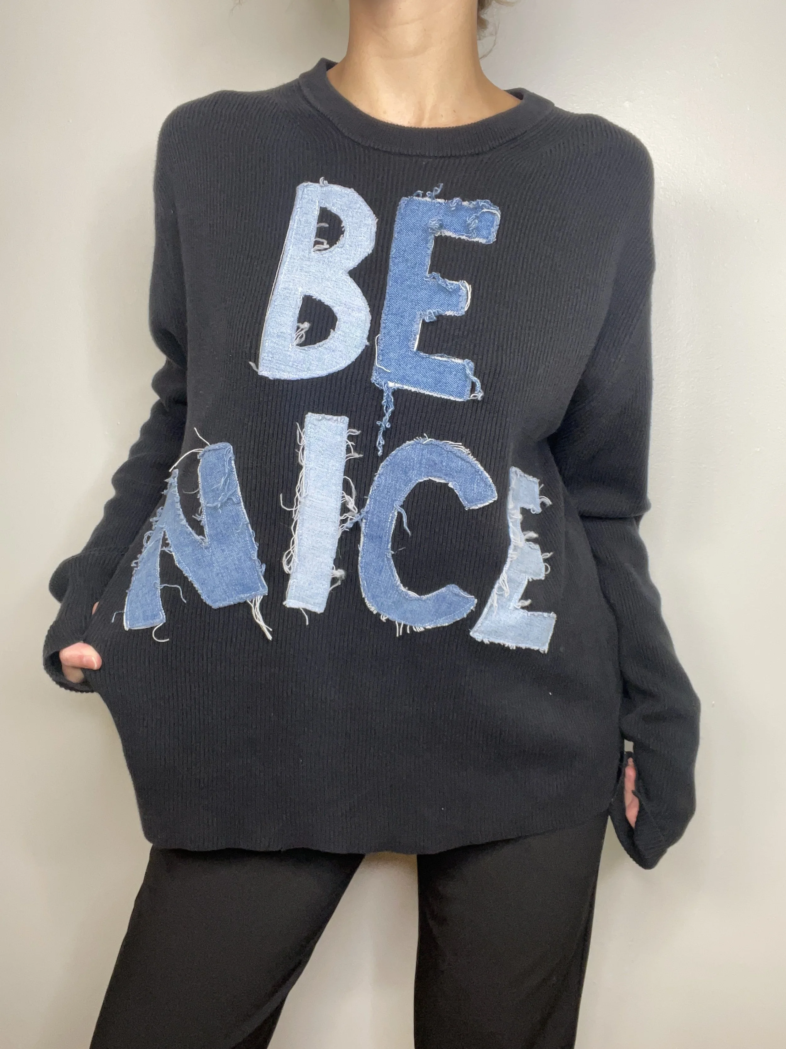 The summer of 2020 I started stitching denim letters onto thrifted crewnecks. My attempt at finding warmth and kindness in the midst of the pandemic. These sweatshirt have taught me so much and have been a big part of my 10,000 hours. Years later these pieces still learning from the ‘Be Nice’ pieces, always serving as a reminder to walk through life with a kind heart no matter what happens. I hope when people see these pieces they stop for a moment and consider how they are showing up for themselves and others. Most of all, I hope you are nice to yourself. Life is hard, and I believe we are all doing the best we can with the tools we have so please choose to be nice. Love you -Mal