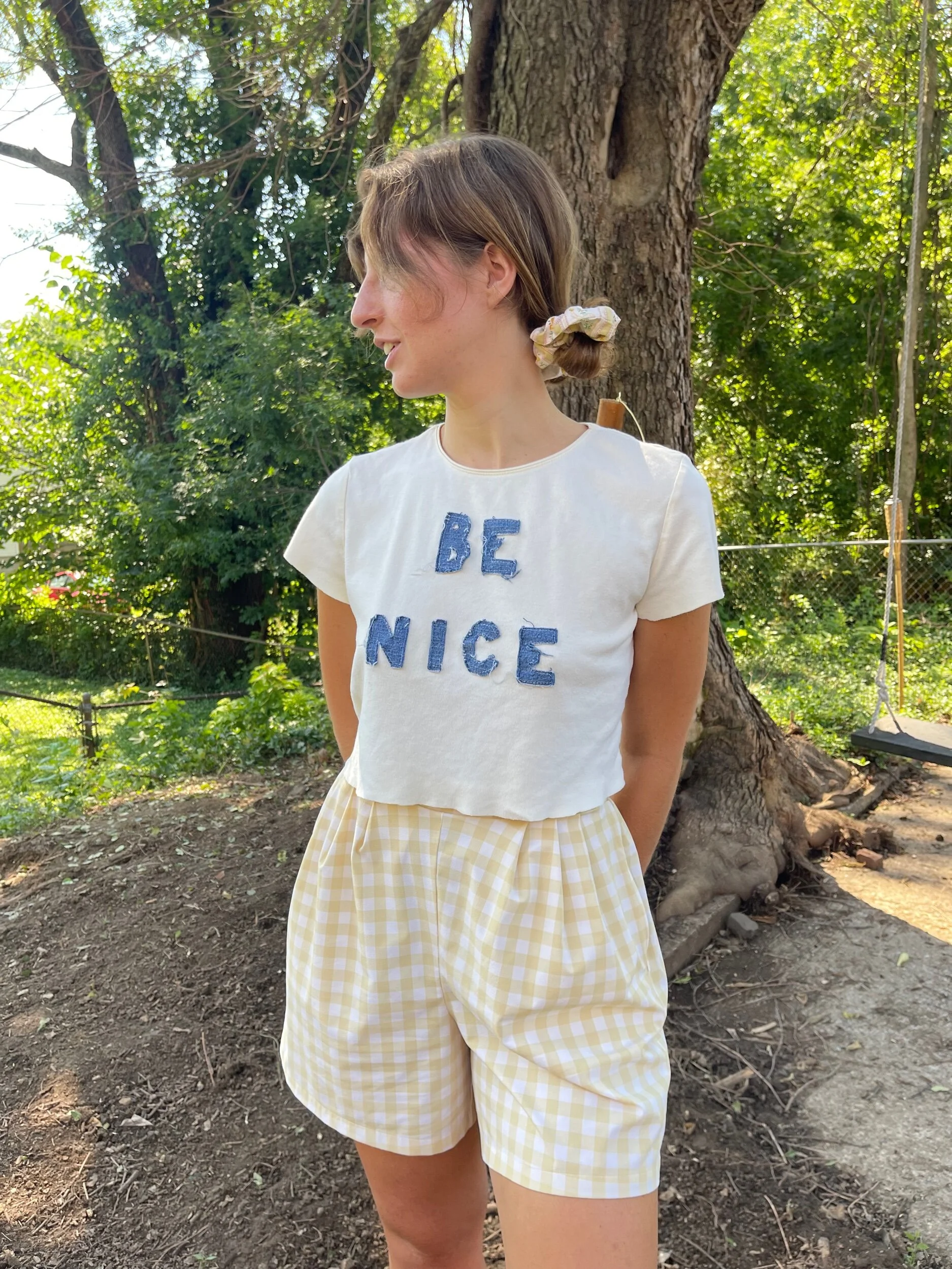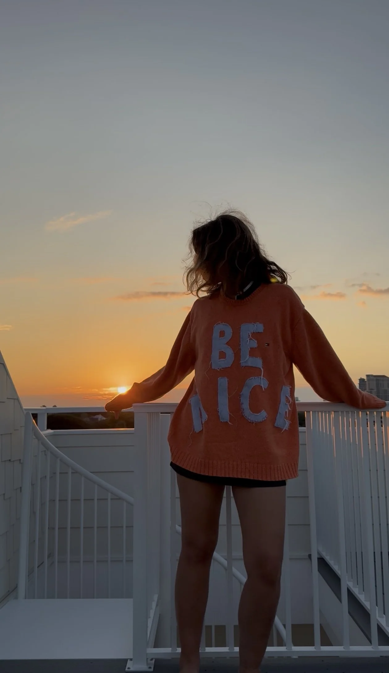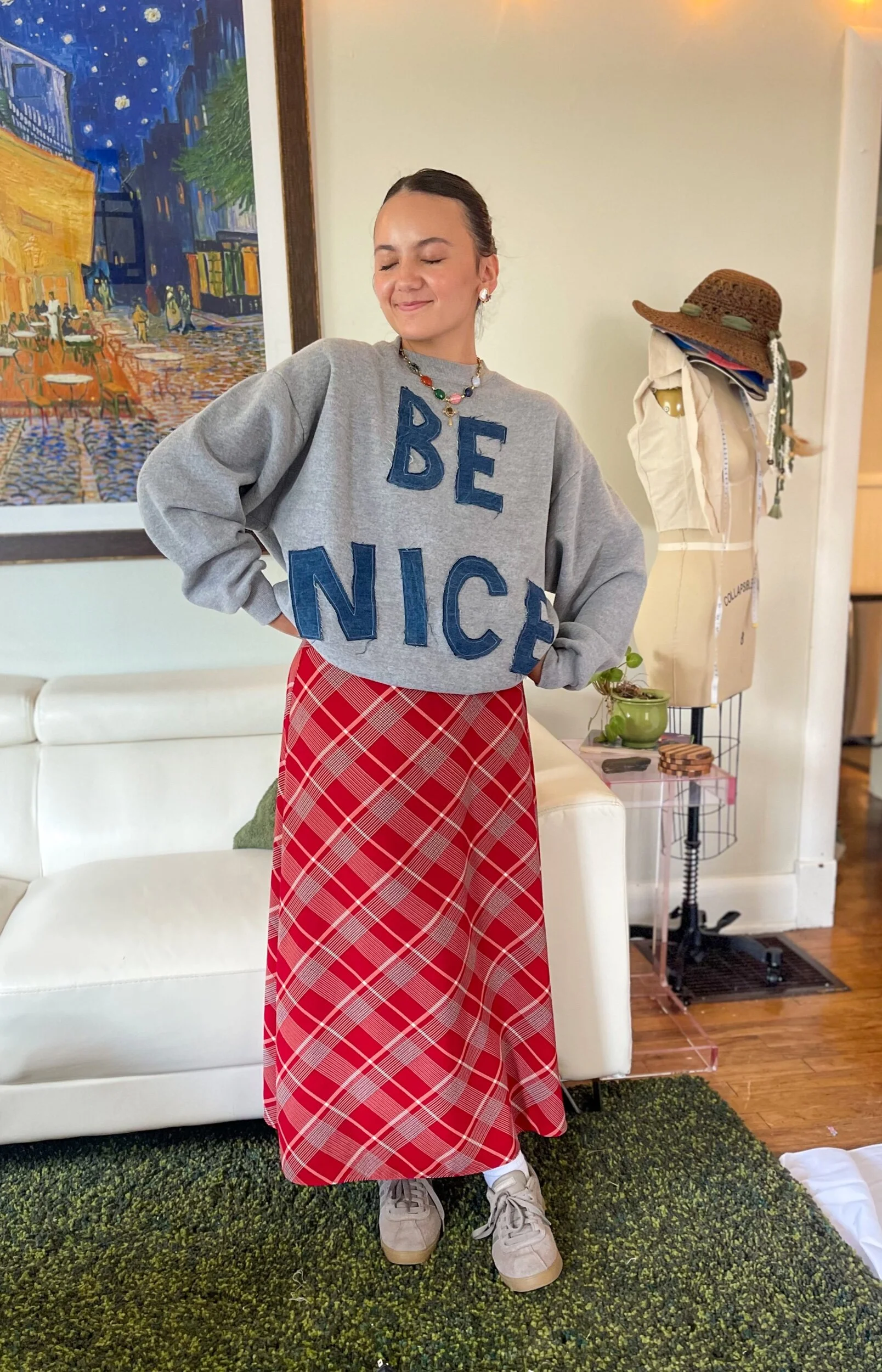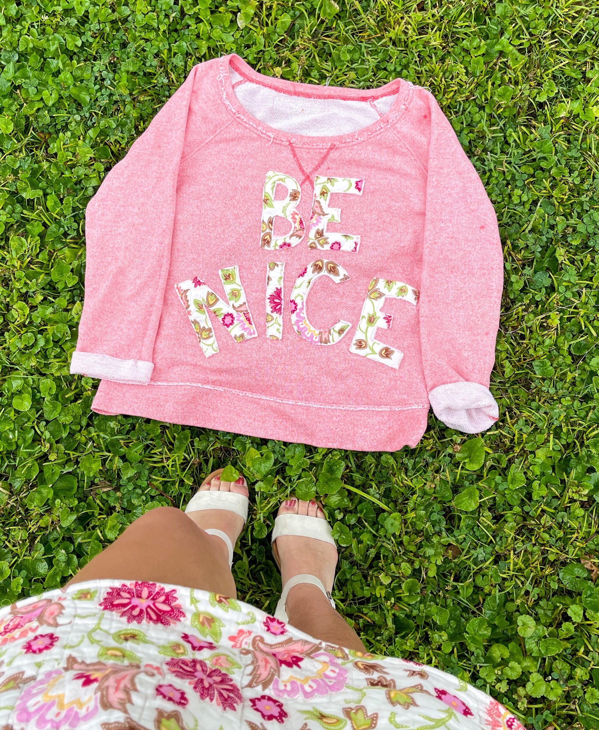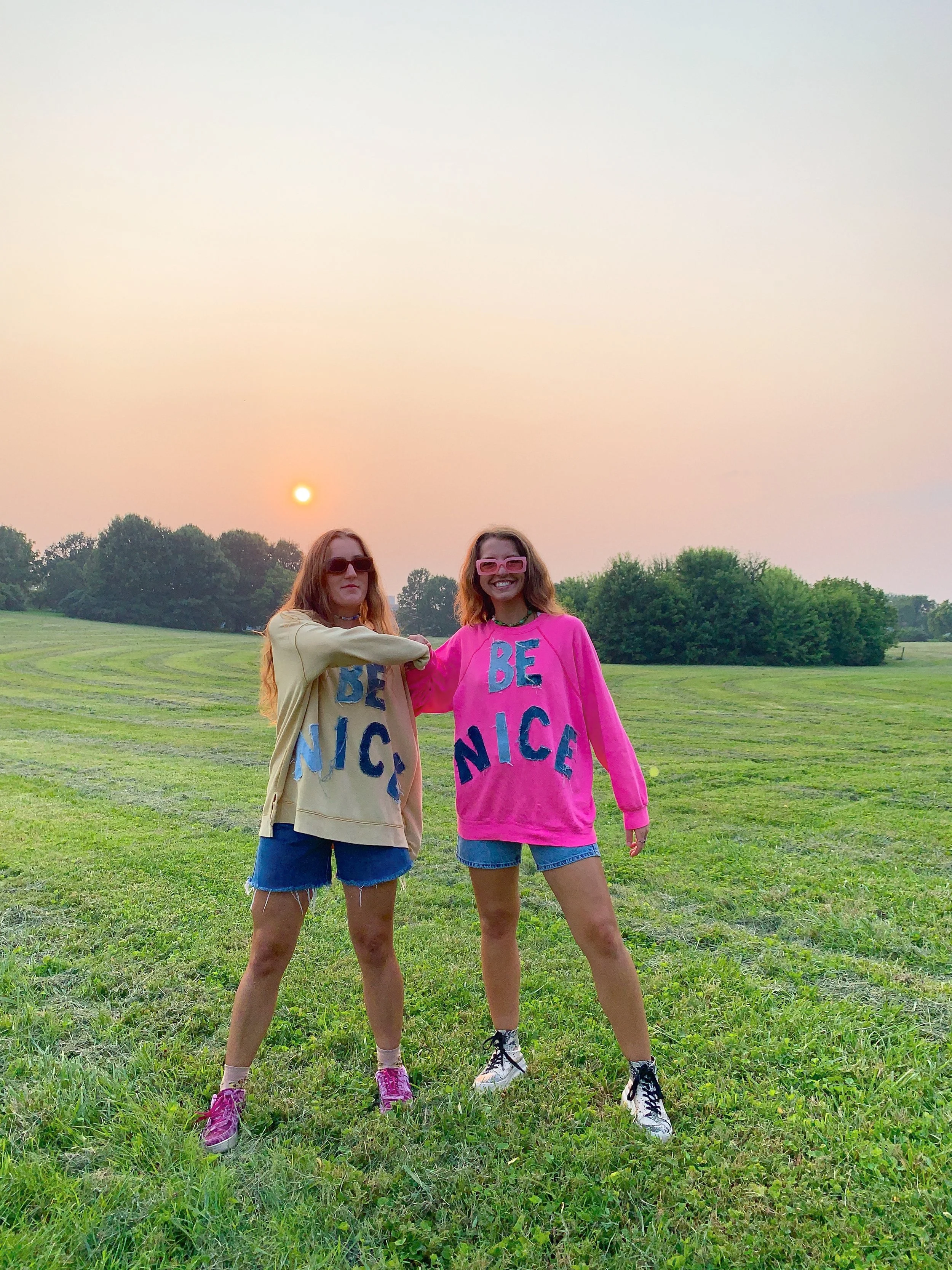The summer of 2020 I started stitching denim letters onto thrifted crewnecks. My attempt at finding warmth and kindness in the midst of the pandemic. These sweatshirt have taught me so much and have been a big part of my 10,000 hours. Years later these pieces still learning from the ‘Be Nice’ pieces, always serving as a reminder to walk through life with a kind heart no matter what happens. I hope when people see these pieces they stop for a moment and consider how they are showing up for themselves and others. Most of all, I hope you are nice to yourself. Life is hard, and I believe we are all doing the best we can with the tools we have so please choose to be nice. Love you -Mal