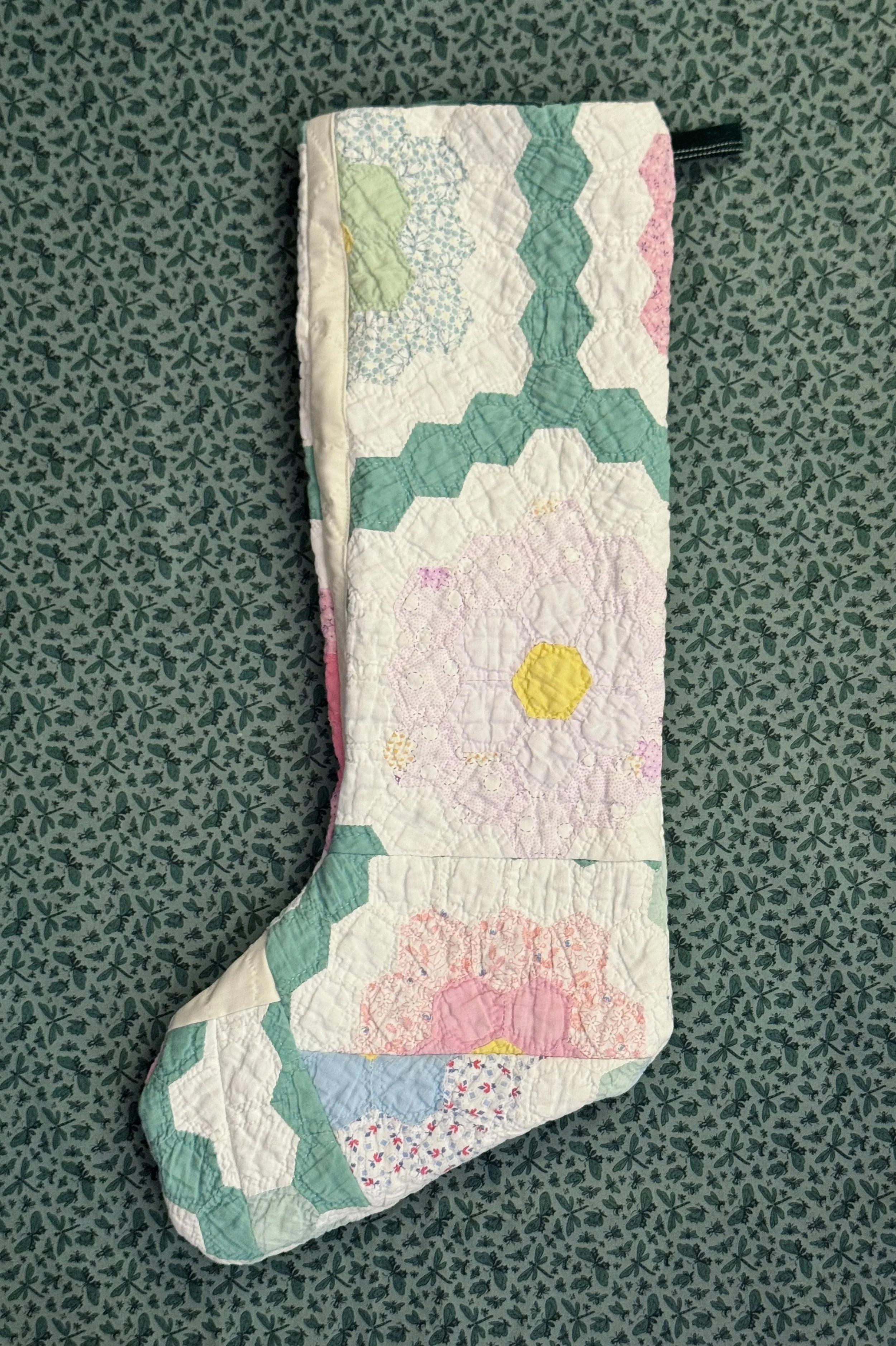 Upcycled bag made using a quilt printed bedspread and vintage turquoise seashell fabric.