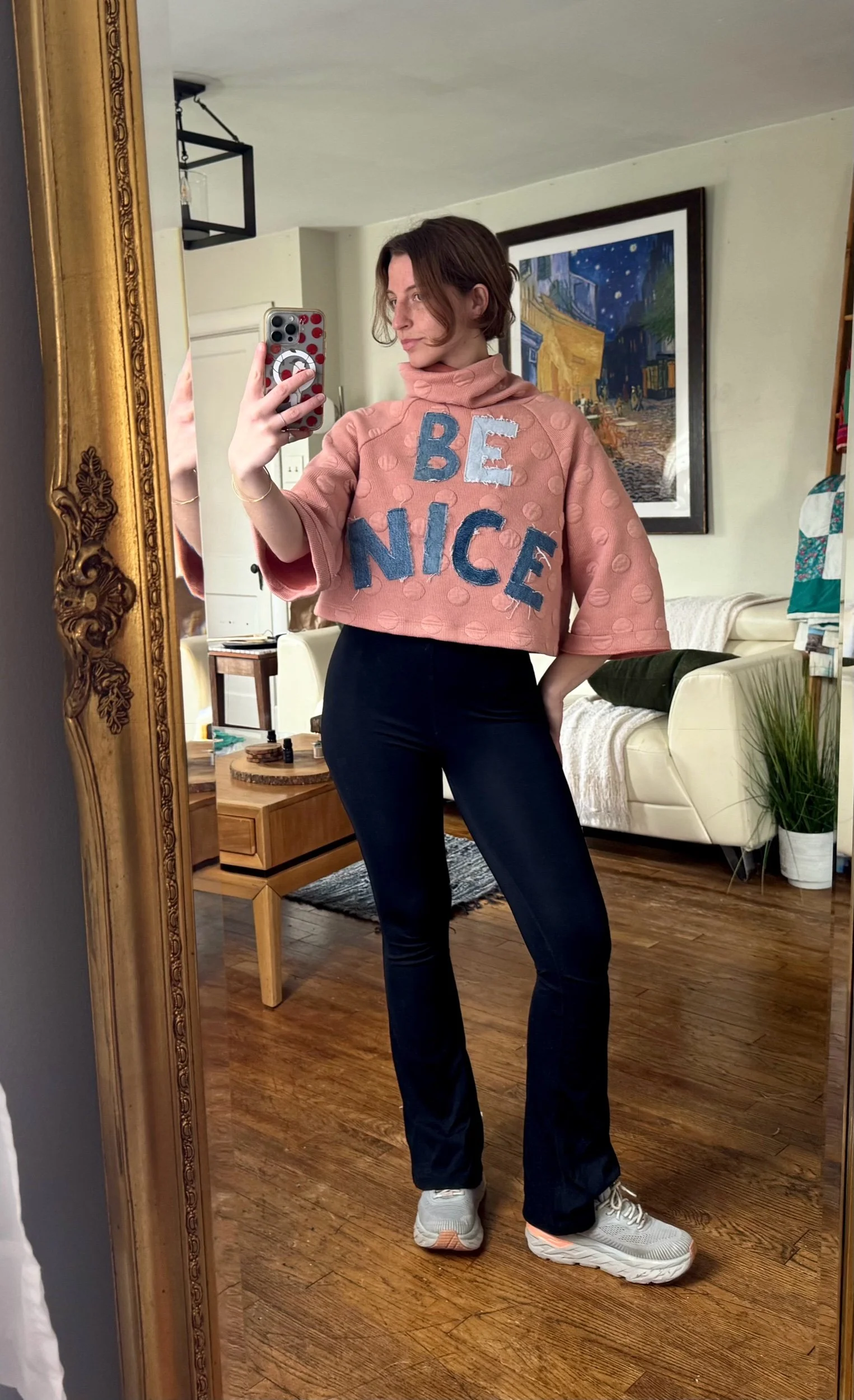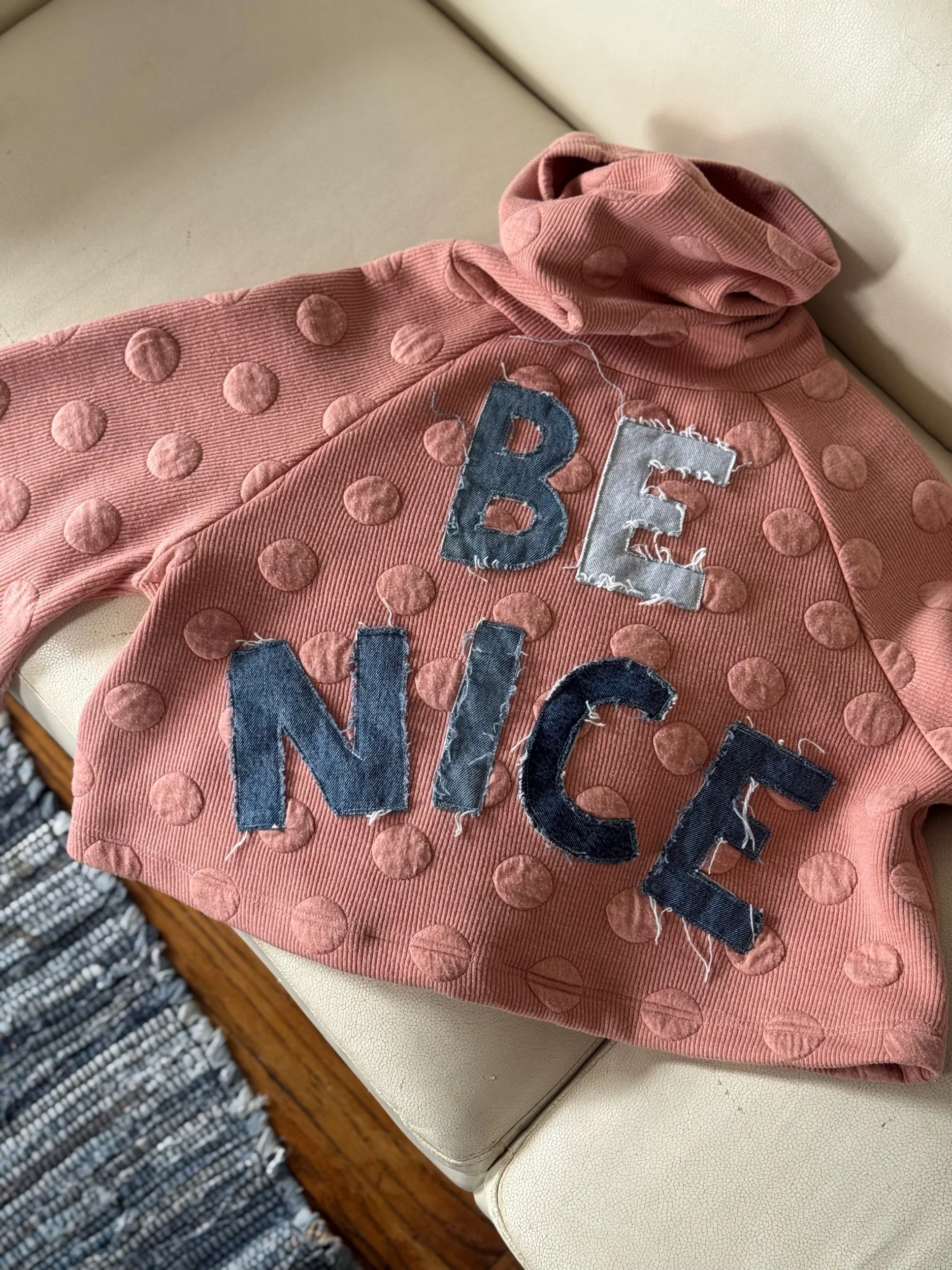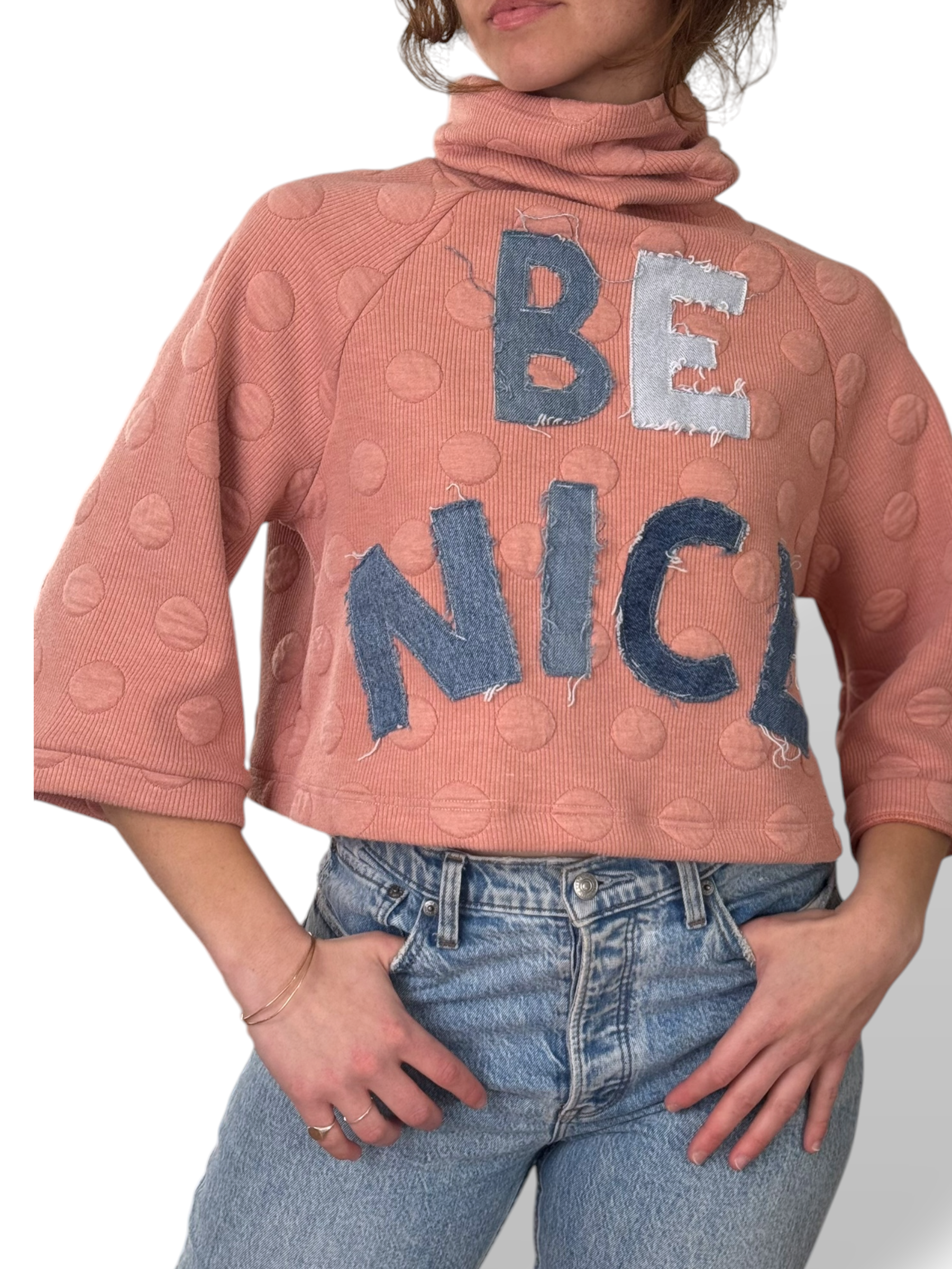 Upcycled Collection › Be Nice Cowl Neck Crew • (M) Image 1 of 6 Image 2 of 6 Image 3 of 6 Image 4 of 6 Image 5 of 6 Image 6 of 6 Be Nice Cowl Neck Crew • (M) $75.00 lettering hand-cut from repurposed denim. Purchase Added! lettering hand-cut from repurposed denim.